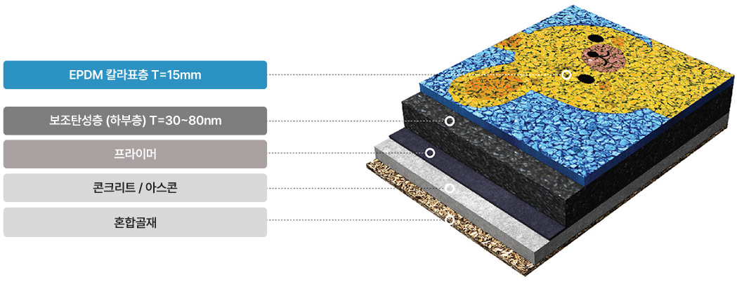 당사가 납품하고 시공하는 놀이터탄성포장재는 환경 친화적인 제품으로 탄성이 우수한 고무칩 및 EPDM-CHIP을 사용하여 어린이 놀이터에 가장 적합한 재료로 쾌적한 환경과